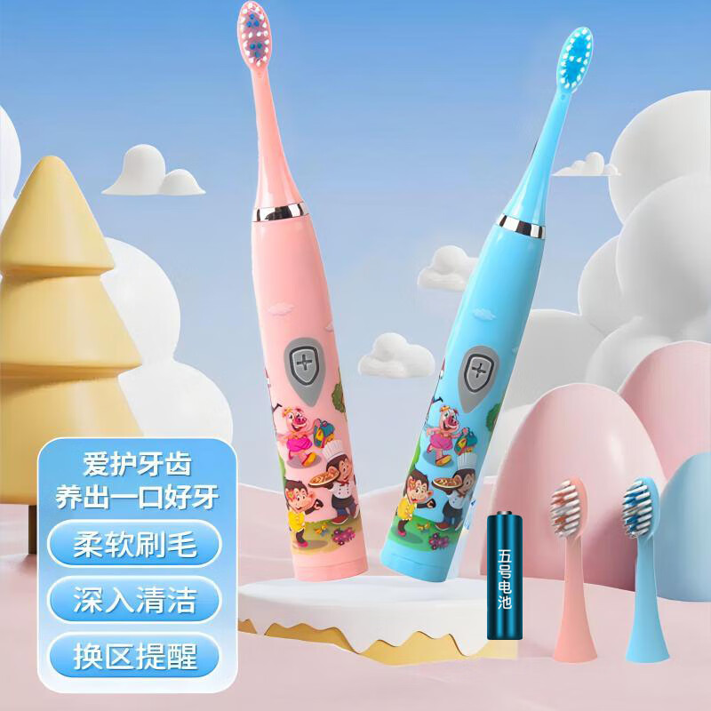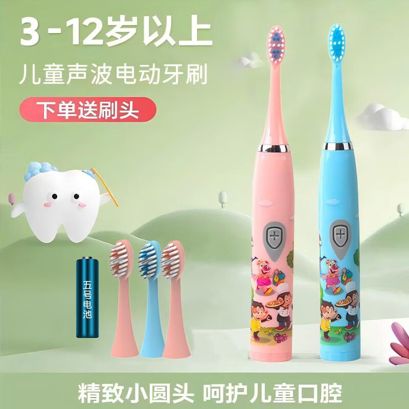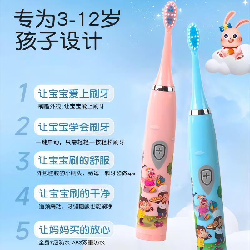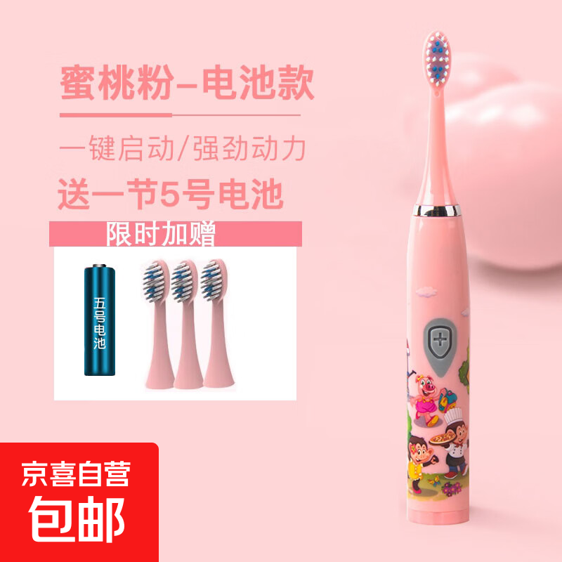 希尔顿儿童声波电动牙刷软毛防水智能牙刷小孩3-9-14岁超细卡通清洁 儿童(电池款)+3刷头+电池+粉色