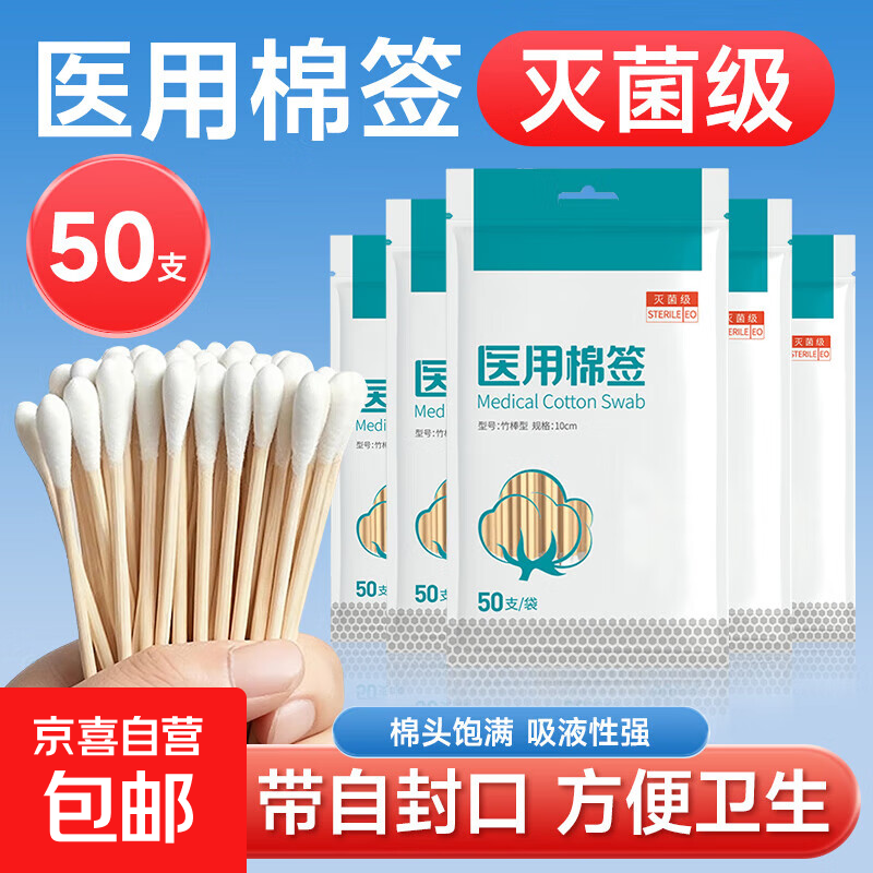 医用无菌消毒棉签一次性脱脂棉花棒上药掏耳朵清洁成人婴儿小包装 【灭菌级10cm】50支【单头棉签】
