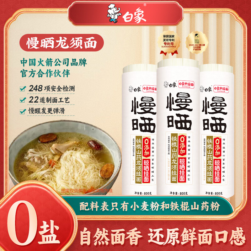 白象慢晒龙须面【铁棍山药0盐配方】800g×3爽滑速食细挂面条营养早餐