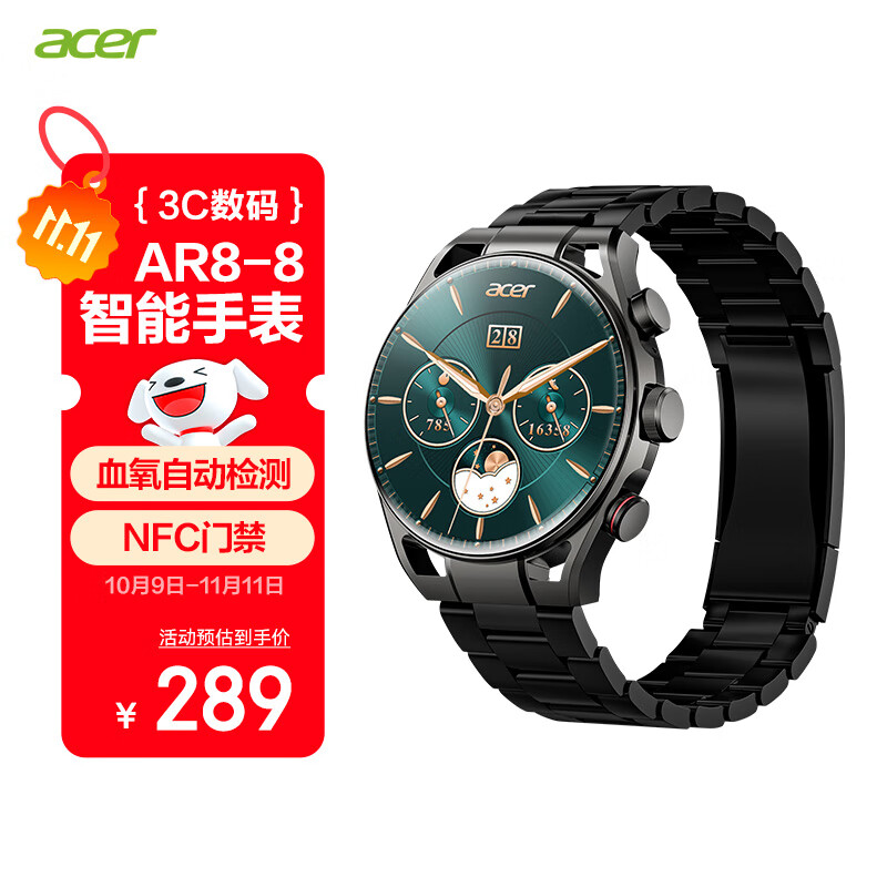 宏碁(acer)智能 1.51英寸AMOLED屏 IP68防水计步睡眠检测健康运动手表NFC门禁 黑色(送蓝牙耳机三风格表带)