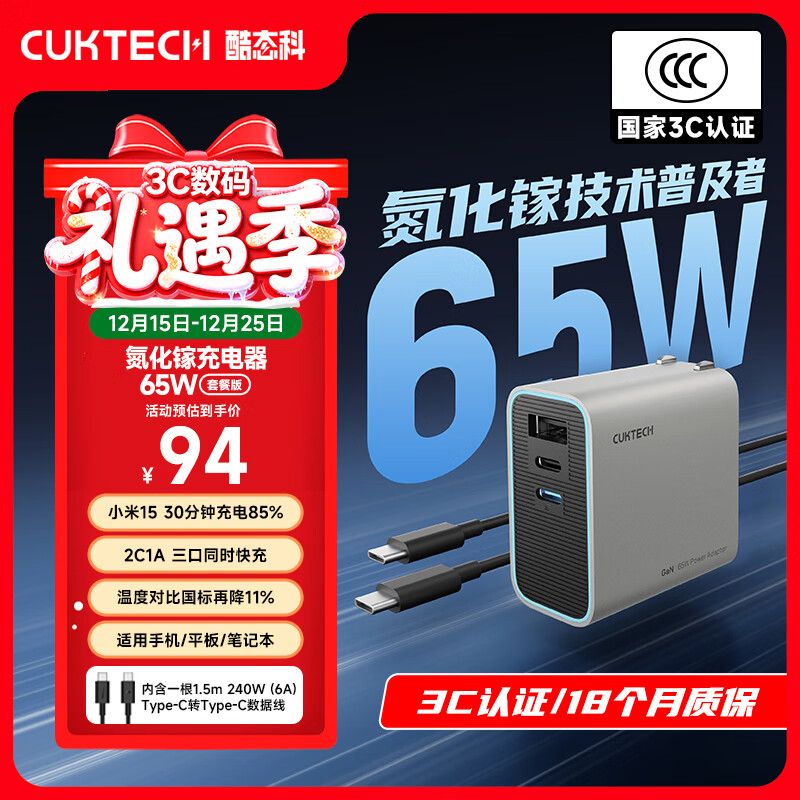 CUKTECH酷态科65W氮化镓充电器套装兼容40W 适用小米/苹果17pd多口Type-C快充头华为Mate70手机笔记本电脑
