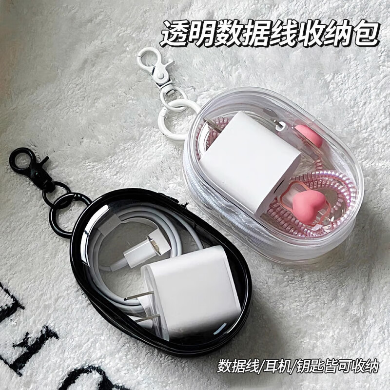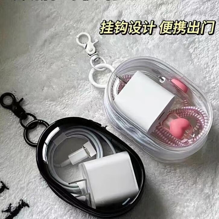 现货数据线充电器收纳透明便携迷你随身外出耳机收纳盒充电整理包 白色(含挂钩)