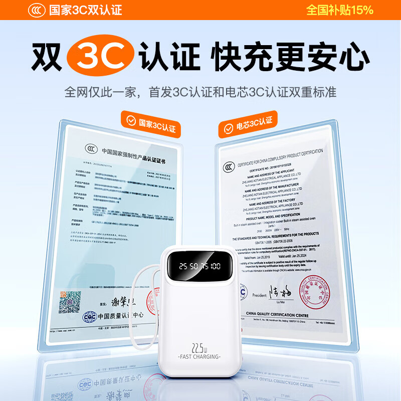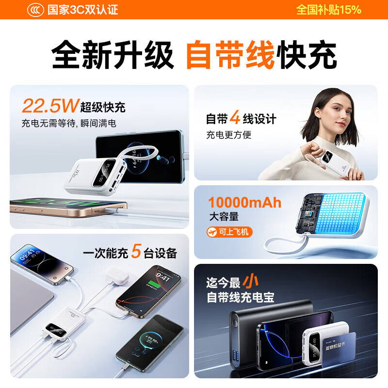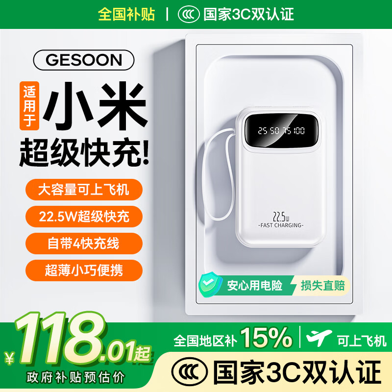 GESOON【国家3C认证|热销200W+】充电宝适用于小米大容量自带线超薄便携小巧可上飞机移动电源国家补贴 【象牙白】可上飞机|22.5W超级快充|真实大容量 20000M|自带4快充线|新3C认证