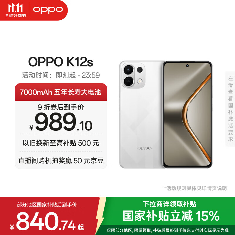 OPPO K12s 8GB+256GB 星芒白 7000mAh长续航大电池 OLED 直屏 骁龙学生 5G 游戏千元新款手机 国家补贴