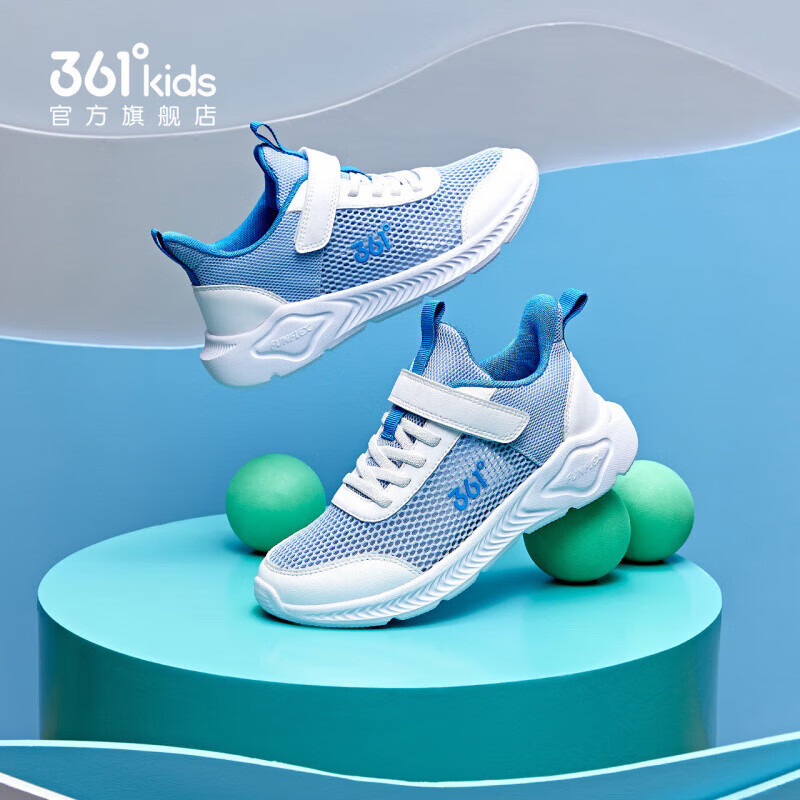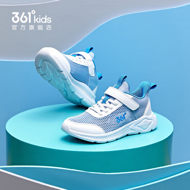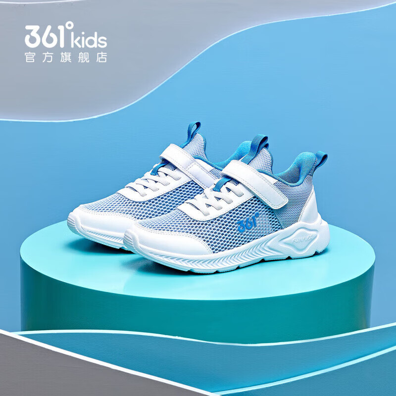 361°儿童运动鞋男童跑鞋夏季大网孔轻便魔术贴女童休闲透气运动鞋 【大网孔】幻象蓝/361度白 34