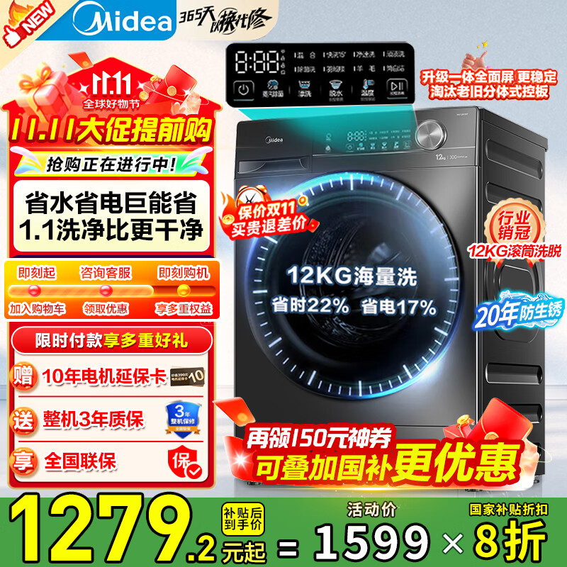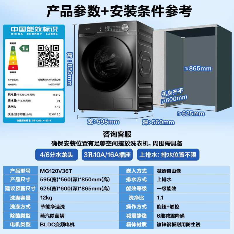 美的滚筒洗衣机全自动 大容量家用 1.1超高洗净比 除菌净螨洗衣机 一级能效 以旧换新 家电国家补贴 12公斤大容量4-7人MG120V36T