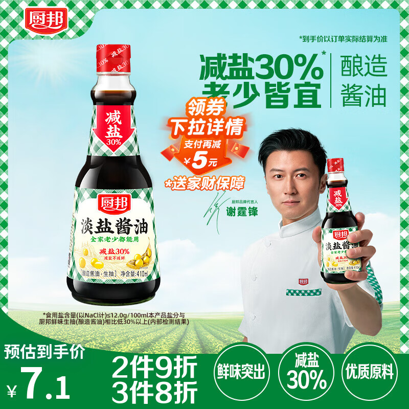 厨邦酱油 薄盐系列 淡盐酱油 生抽【黄豆酱油】410ml 酿造酱油减盐30%