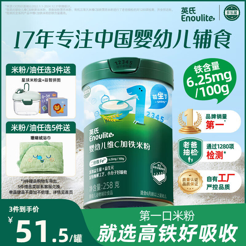 英氏婴幼儿高铁米粉糊维C加铁原味258g宝宝辅食低敏6-12个月老爸抽检