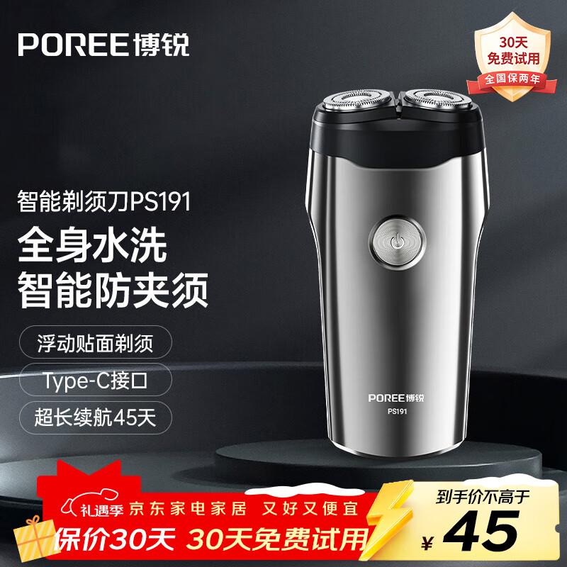 博锐(POREE)剃须刀电动小巧便携车载商务机身轻便旋转全身水洗防夹须干湿双剃刮胡刀须刨送男友送长辈礼物 全身水洗 45天续航 PS191