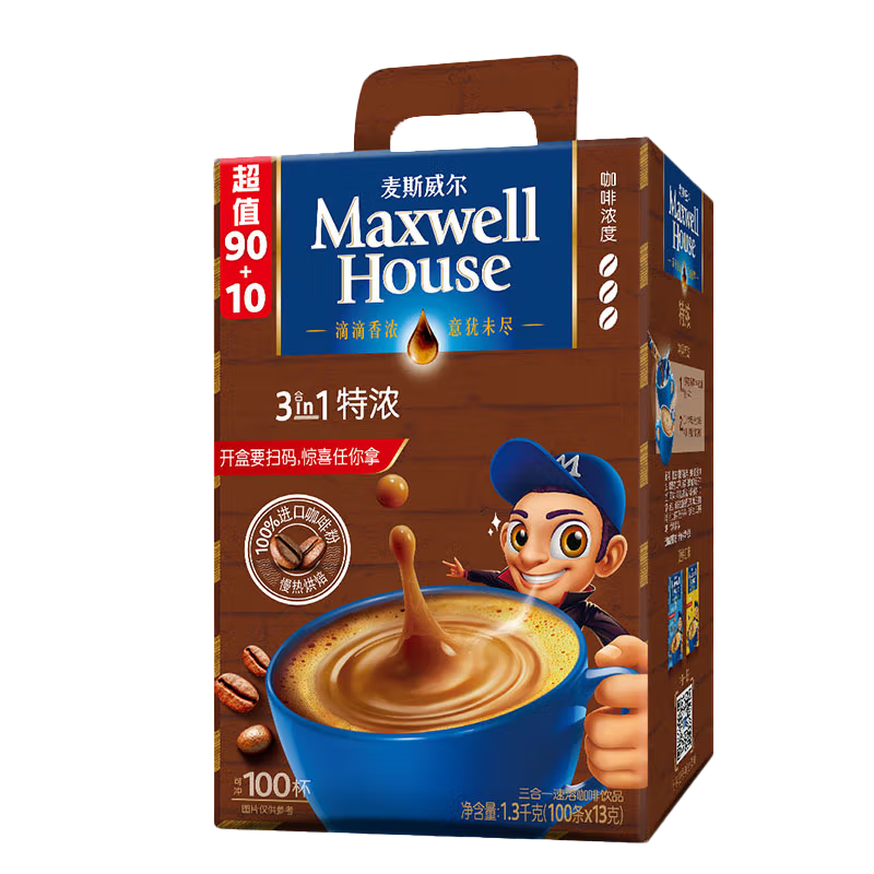 麦斯威尔(Maxwell House) 咖啡 三合一特浓味速溶咖啡粉(新老包装随机发) 100条袋装(无赠)