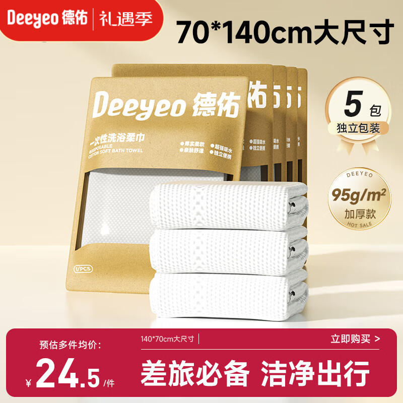 德佑一次性浴巾5条装加大加厚单独包装柔软舒适酒店用品便携旅行装