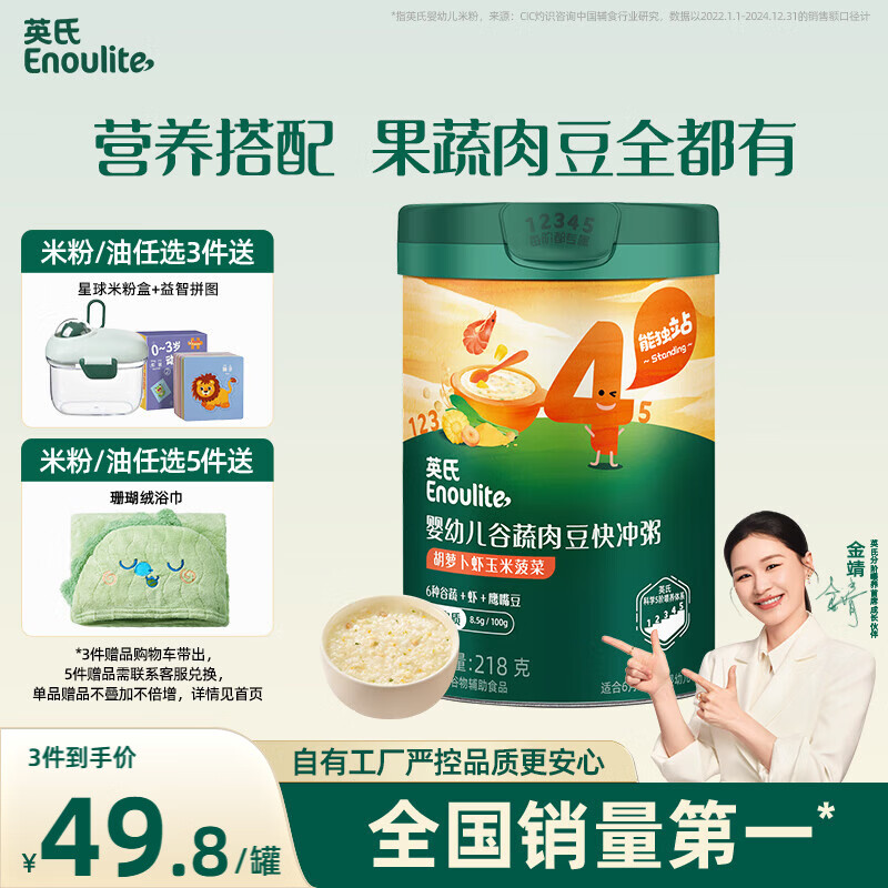 英氏婴儿营养辅食粥胡萝卜虾玉米菠菜218g 宝宝即食冲泡粥快冲粥10月+