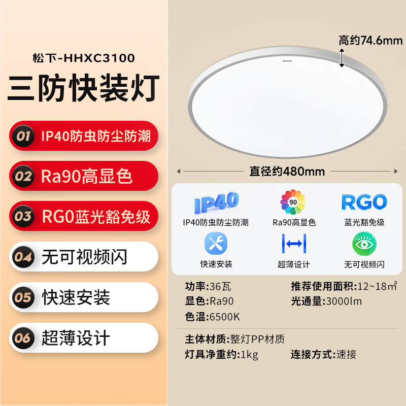 松下(Panasonic)吸顶灯卧室阳台书房灯RA90高显色IP40三防36瓦HHXC3100【包安装】