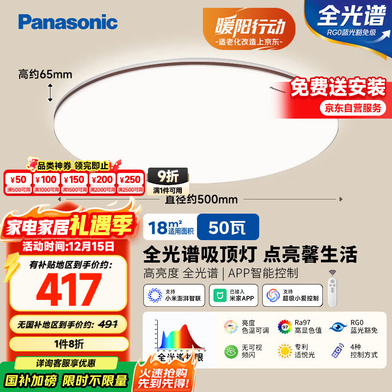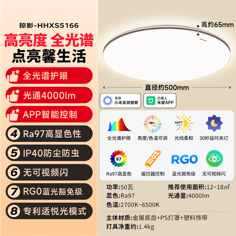松下(Panasonic)吸顶灯智能APP全光谱卧室灯 IP40护眼灯50瓦HHXS5166