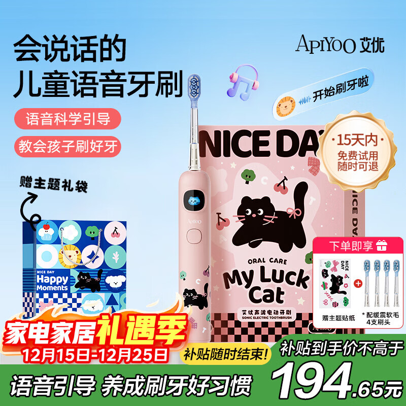 ApiYoo艾优A9pro儿童电动牙刷智能语音提醒软毛护龈 适用3-15岁学生男女小孩生日儿童圣诞礼物 国家补贴