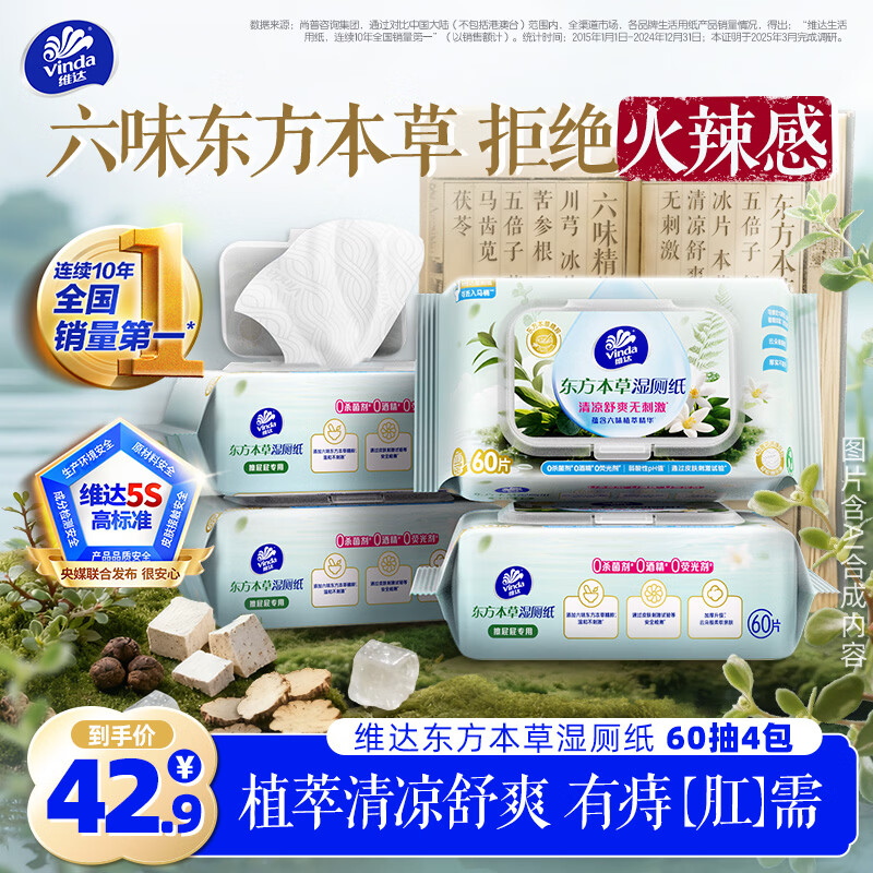 维达(Vinda)痔疮湿厕纸60片*4包东方本草加大加厚清凉舒缓痔疮专用洁厕湿纸巾