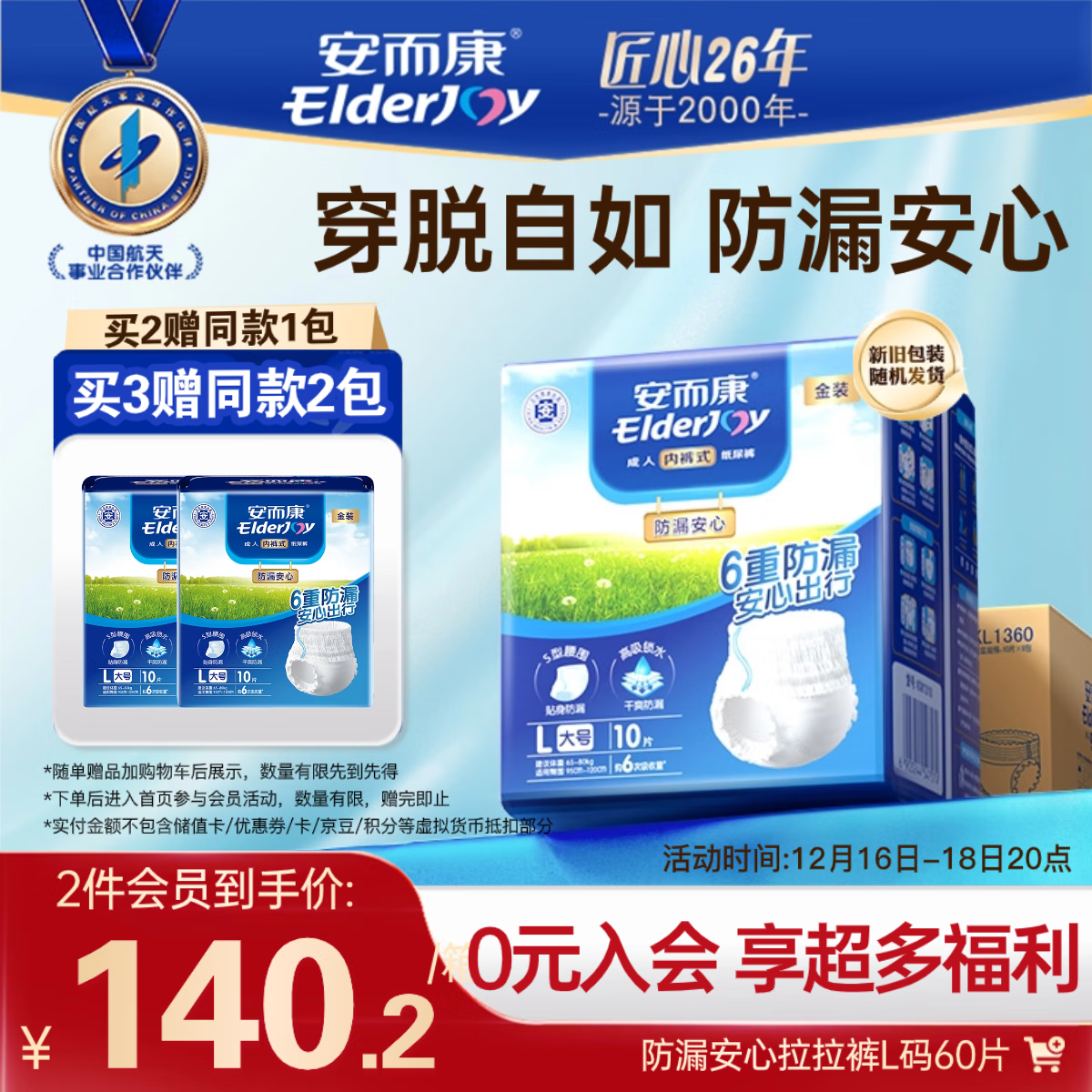 安而康(Elderjoy)防漏安心成人拉拉裤L60片臀围95-120cm内裤式成人纸尿裤易穿脱