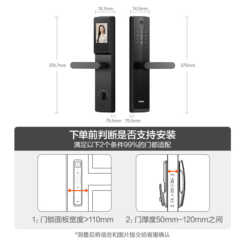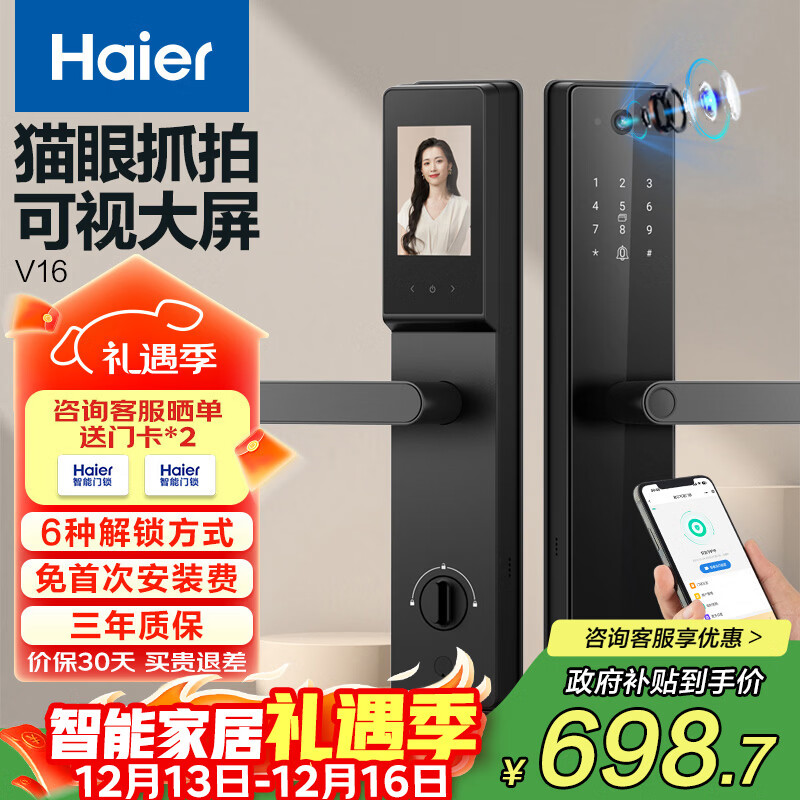 海尔(Haier)指纹锁智能门锁密码锁可视猫眼智能锁带监控摄像头16V大屏执手锁