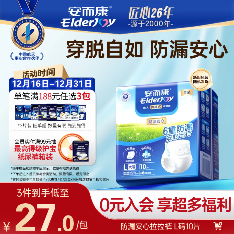 安而康(Elderjoy)防漏安心成人拉拉裤L10片臀围95-120cm内裤式成人纸尿裤易穿脱