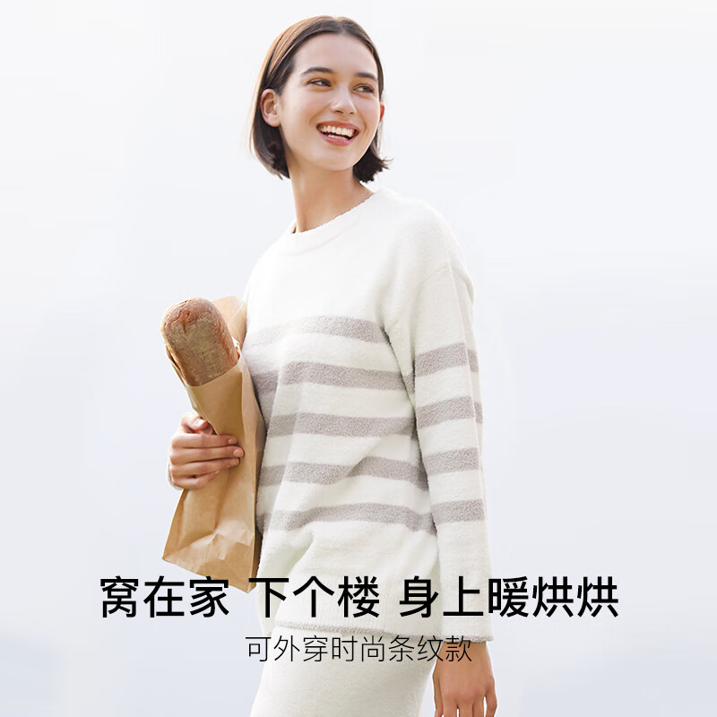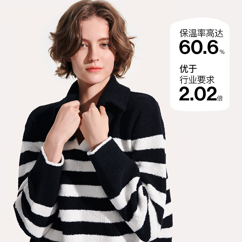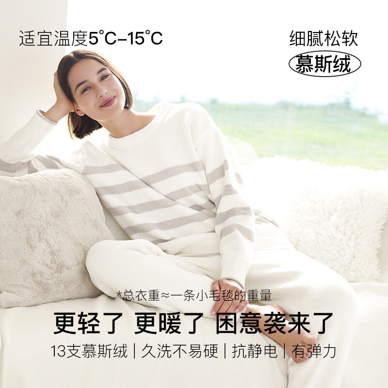 ubras【刘雯同款】慕斯绒条纹保暖加绒家居服套装女加厚加绒睡衣冬季女 小翻领-白色 M