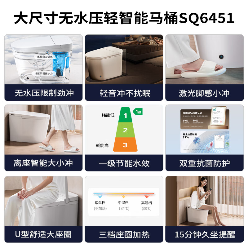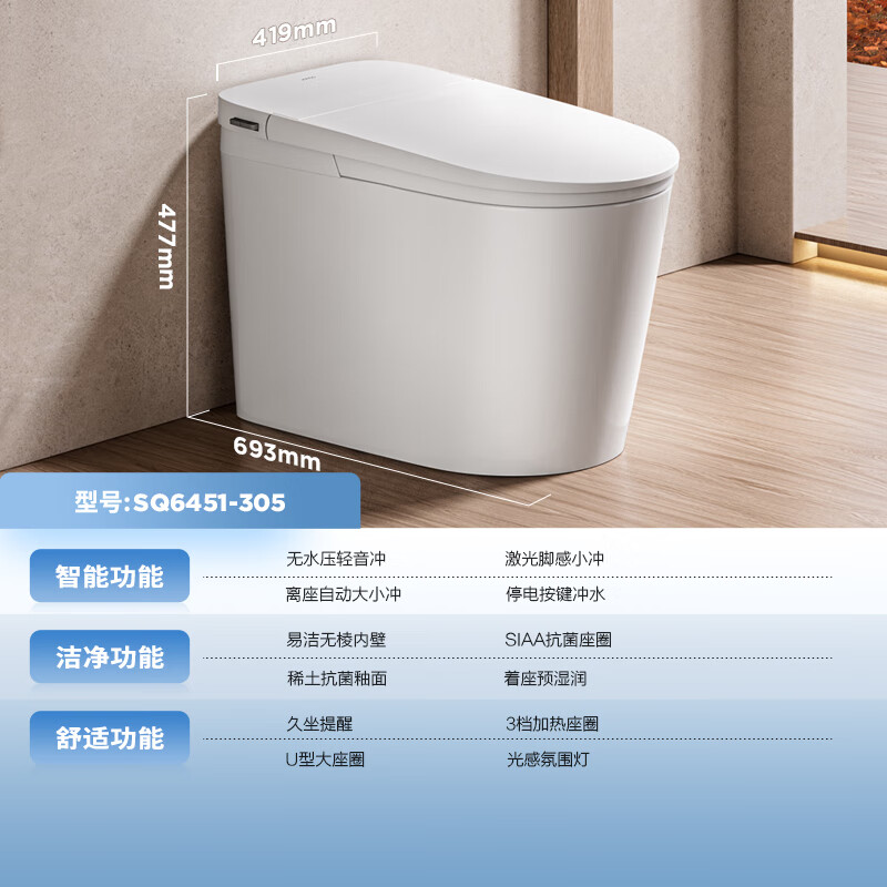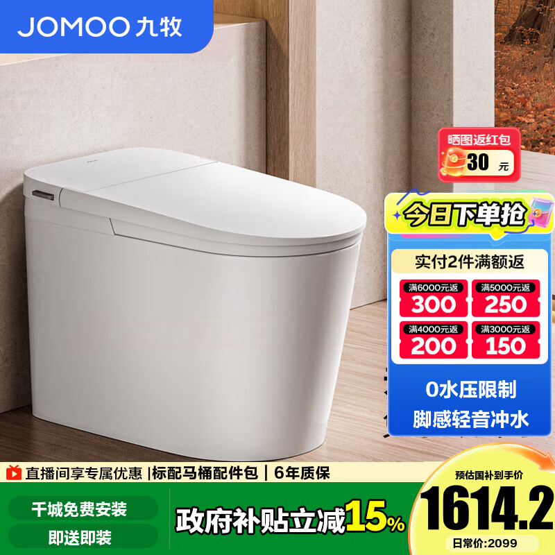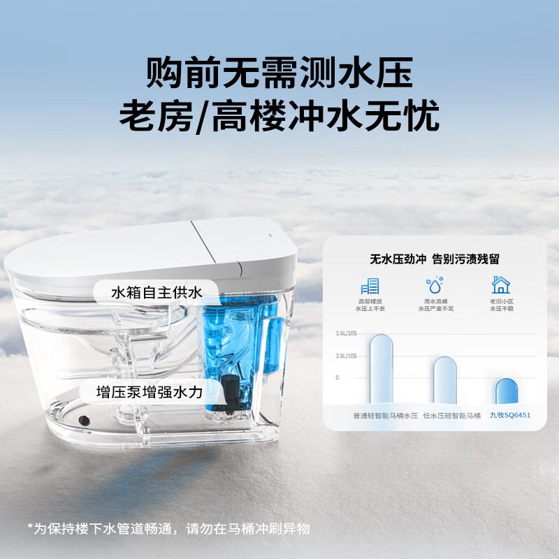 九牧(JOMOO)国家补贴轻智能马桶静音冲无水压限制家用一体机虹吸坐便器SQ6451 静音冲不限水压脚感轻智能马桶 坑距是290-390选305