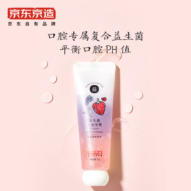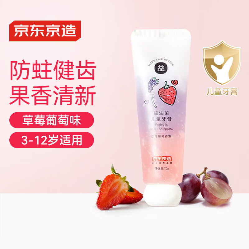 京东京造 益生菌儿童牙膏 草莓葡萄70g 3-12岁适用 儿童防蛀护龈健齿 含氟