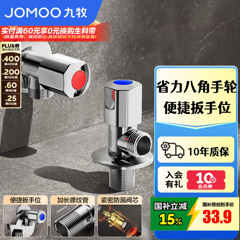 九牧(JOMOO)角阀黄铜加厚陶瓷阀芯八字阀三角阀冷热水角阀马桶角阀水阀 【升级手轮】1冷1热角阀-预售