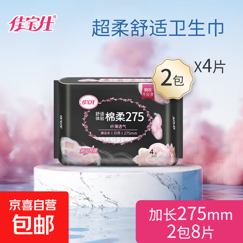 佳宝仕加长日用卫生巾棉柔舒适干爽亲肤姨妈巾臻选系列275mm日用4片/包 棉柔 275mm 8片 共2包