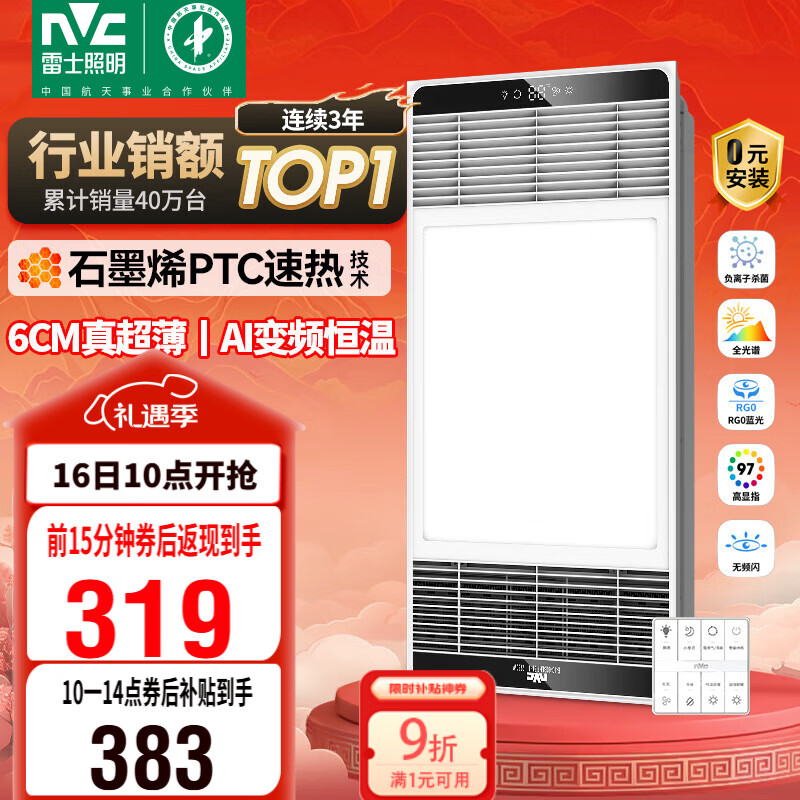 雷士(NVC)政府补贴风暖变频超薄浴霸人感夜灯浴室暖风照明排风换气一体Y417