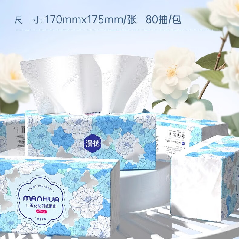 漫花山茶花大包抽纸原生木浆纸巾五层加厚大尺寸面巾纸医护级餐巾纸 5层 400张*18包