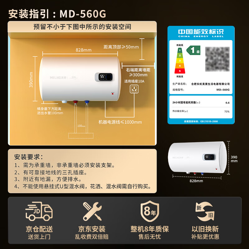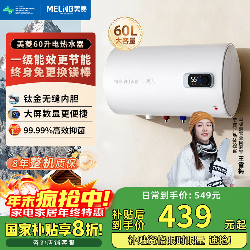 美菱电热水器60升免更换镁棒政府补贴20%一级能效家用节能储水式热水器2200W速热电脑数显质保8年560G