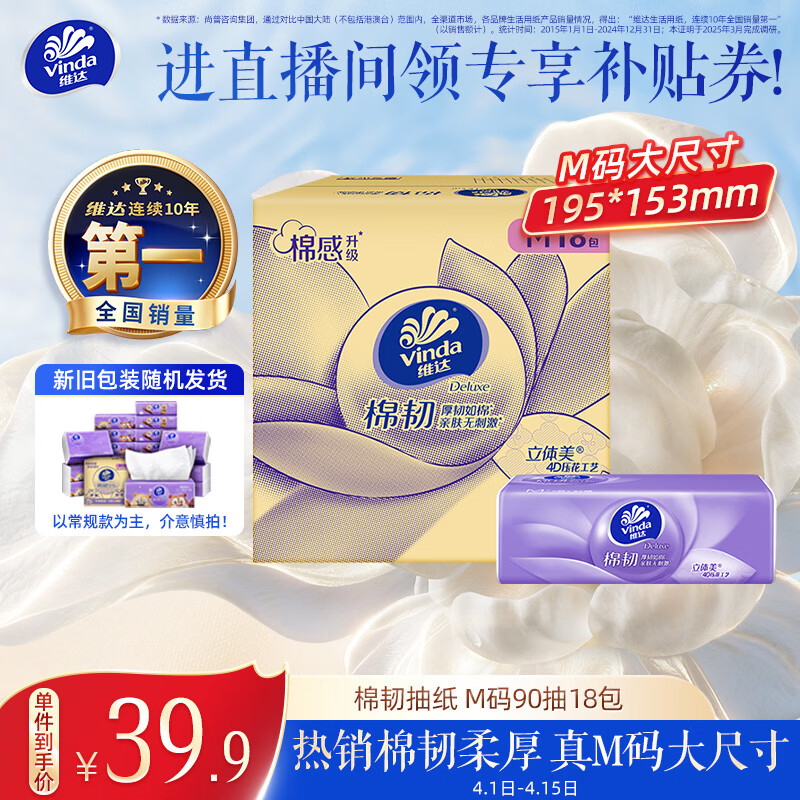 维达(Vinda)抽纸 棉韧3层90抽*18包M码纸巾 卫生纸纸抽整箱 新旧包装随机发货