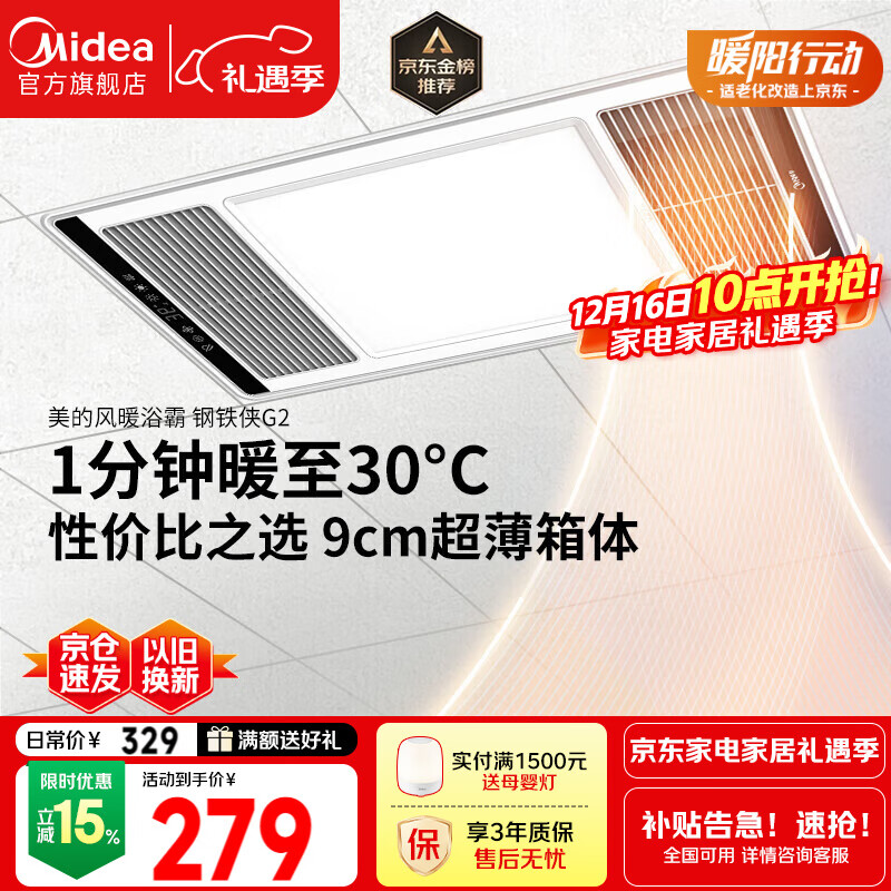 美的(Midea)浴霸暖风照明排气一体集成300x600风暖卫生间暖风机换气浴霸灯G2