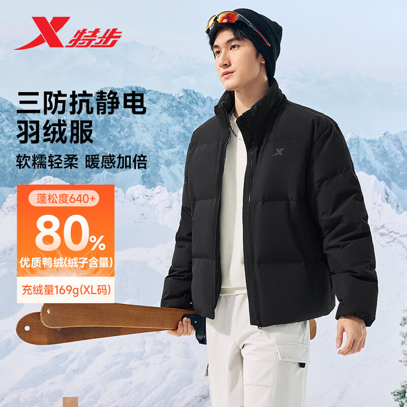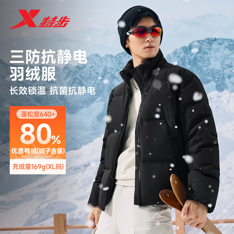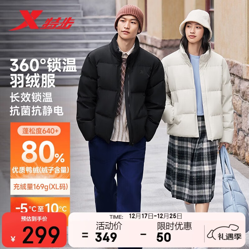 特步羽绒服男女秋冬保暖加绒加厚户外运动简约百搭三防