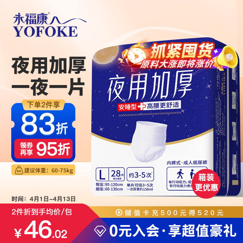 永福康夜用加厚成人拉拉裤L28片 臀围95-120cm 老人孕产妇内裤型纸尿裤