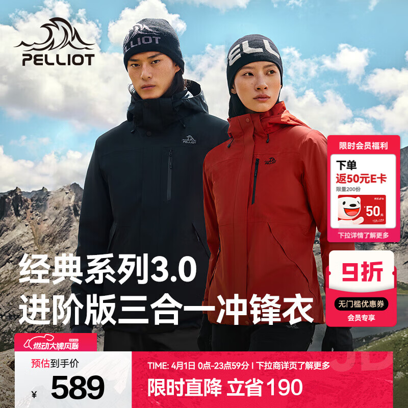 伯希和(Pelliot)【经典3.0山野】冲锋衣三合一男女春秋户外防风防水登山外套夹克 【简约百搭】男漫暮黑 | 配置升级 L