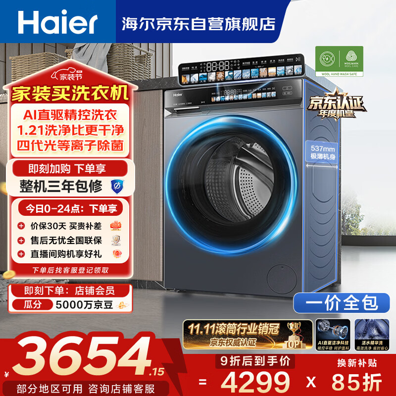 海尔(Haier)云溪4.0 滚筒洗衣机单洗全自动家用 10公斤超薄 AI直驱精华洗 京东自营G583 以旧换新