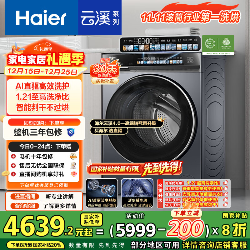 海尔(Haier)云溪4.0系列583 滚筒洗衣机全自动带烘干洗烘一体 10公斤自营超薄家用国家补贴一级能效 73K相似款