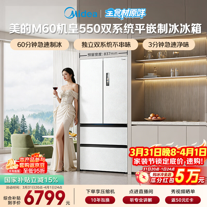 美的(Midea)M60机皇550法式四开门冰箱523L大容量超薄嵌入式双系统除菌一级能效制冰白MR-550WUFIPZE国家补贴