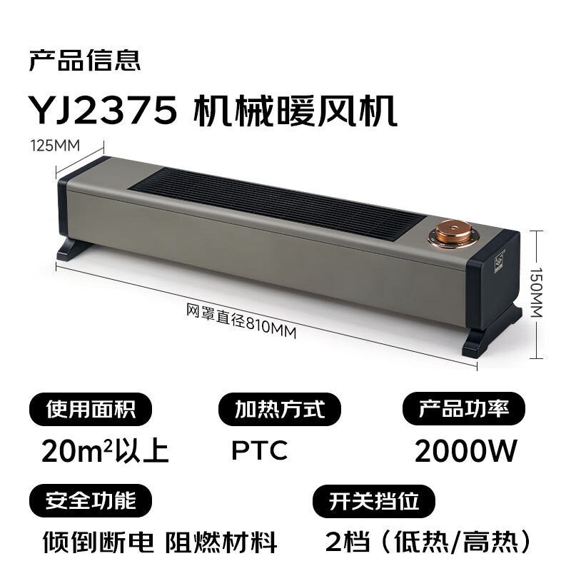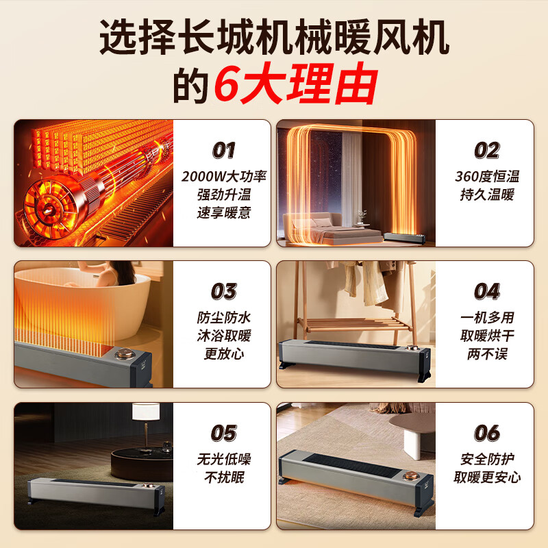 长城取暖器踢脚线家用暖风机电暖气大面积速热全屋升温神器移动地暖干衣暖风智能恒温(机械款)YJ2375
