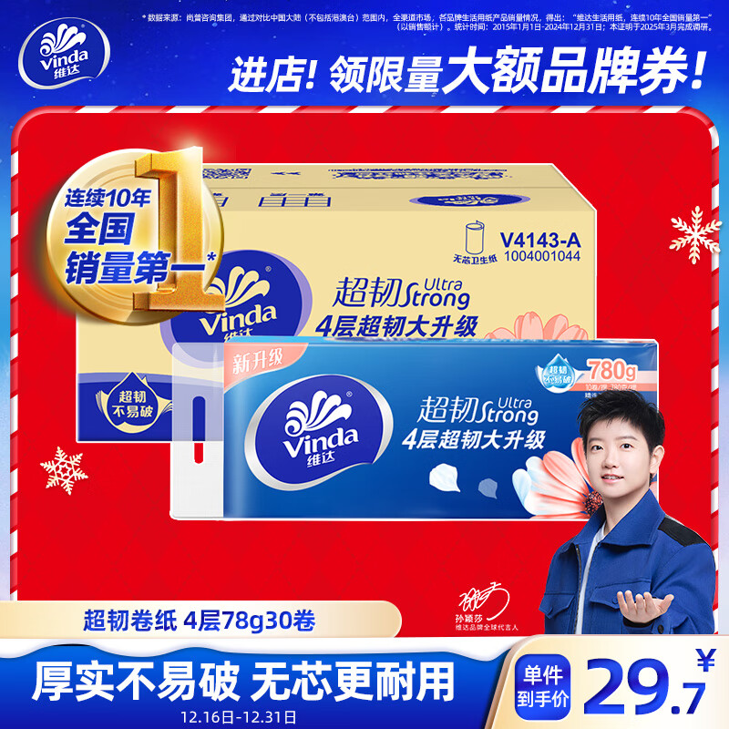 维达(Vinda)无芯卷纸 超韧4层78克*30卷 加厚升级 卫生纸厕纸卷筒纸纸巾整箱