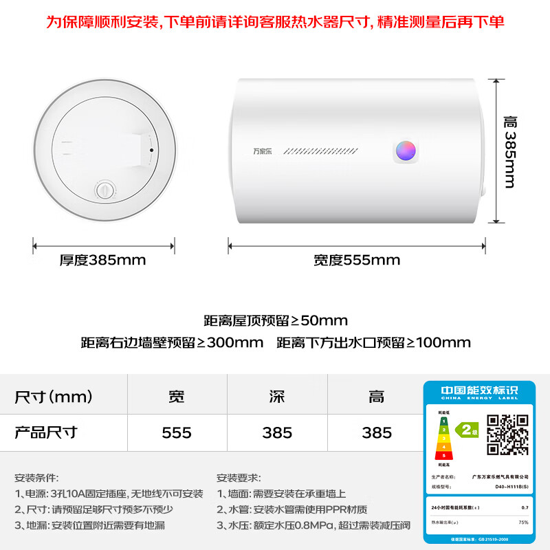 万家乐电热水器【节能大师H111B(S)租房优选防漏电】40升2200W速热大水量小型储水式家用D40-H111B(S)