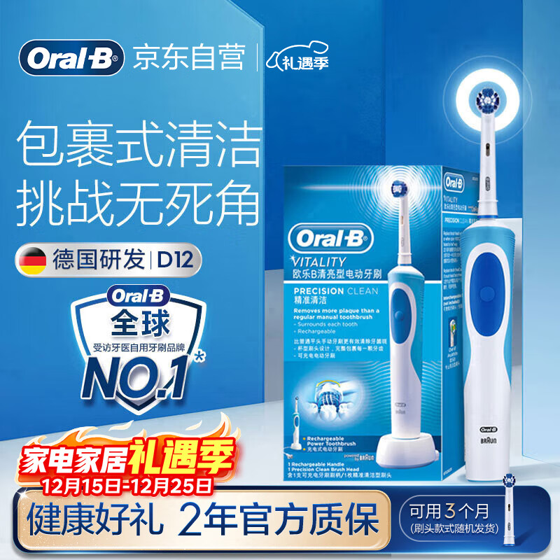 欧乐B电动牙刷男士女士D12清亮型日常清洁(刷头*1)圆头京东自营热卖榜商务送礼生日礼物圣诞礼物