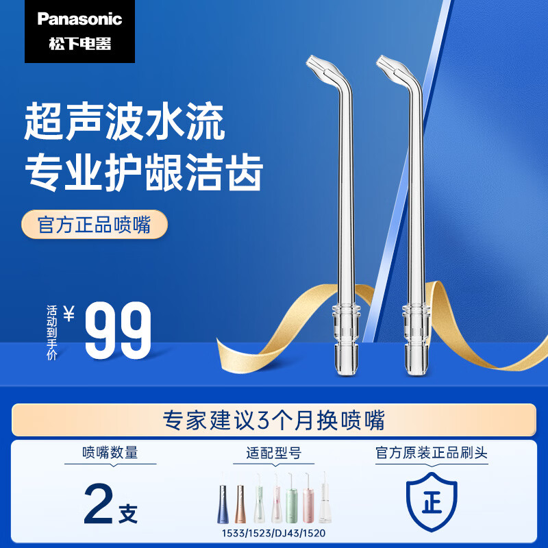 松下(Panasonic)超声波水流洁牙喷嘴瞬时洁齿缝 适用于1520/1533/1523/DJ43替换喷嘴 2支装WEW0986X405