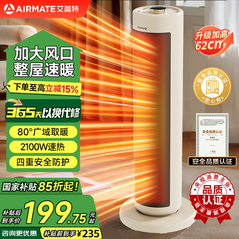 艾美特(AIRMATE)取暖器家用塔式暖风机轻音节能电暖气2100W大功率速热电暖器大面积广角取暖立式倾倒自动断电 24年新款【2100W速热】整屋取暖
