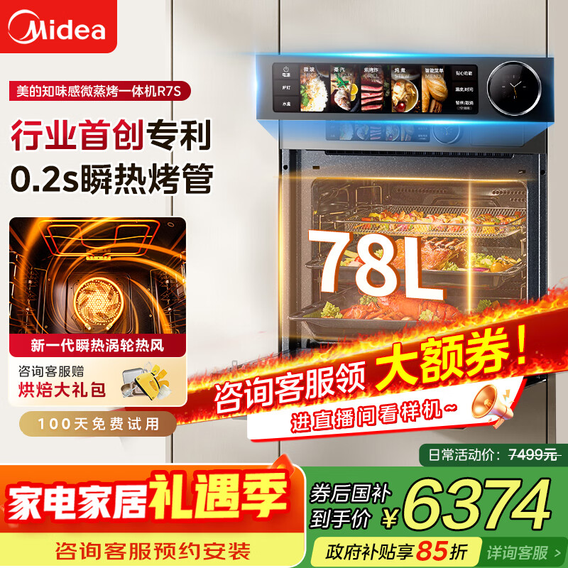 美的(Midea)【毫秒瞬热烤管】嵌入式微蒸烤一体机GR7S温湿智控78L蒸烤箱微蒸烤炸炖5合1烤贝果美的知味感R7S