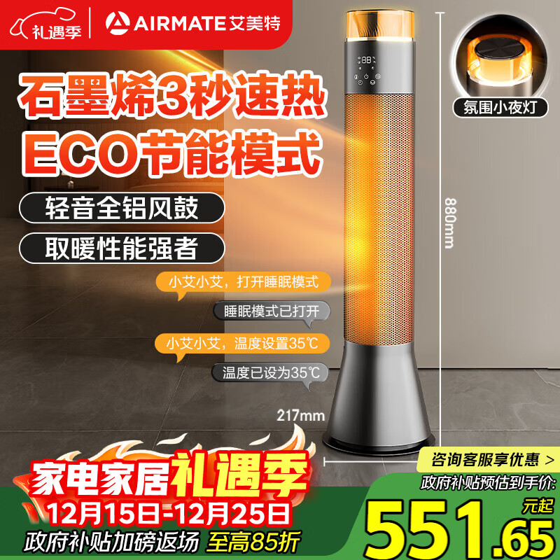 艾美特(AIRMATE)【别墅级取暖】石墨烯暖风机/取暖器/电暖器/电暖气片家用/热风机 88cm语音橙光塔大面积速热
