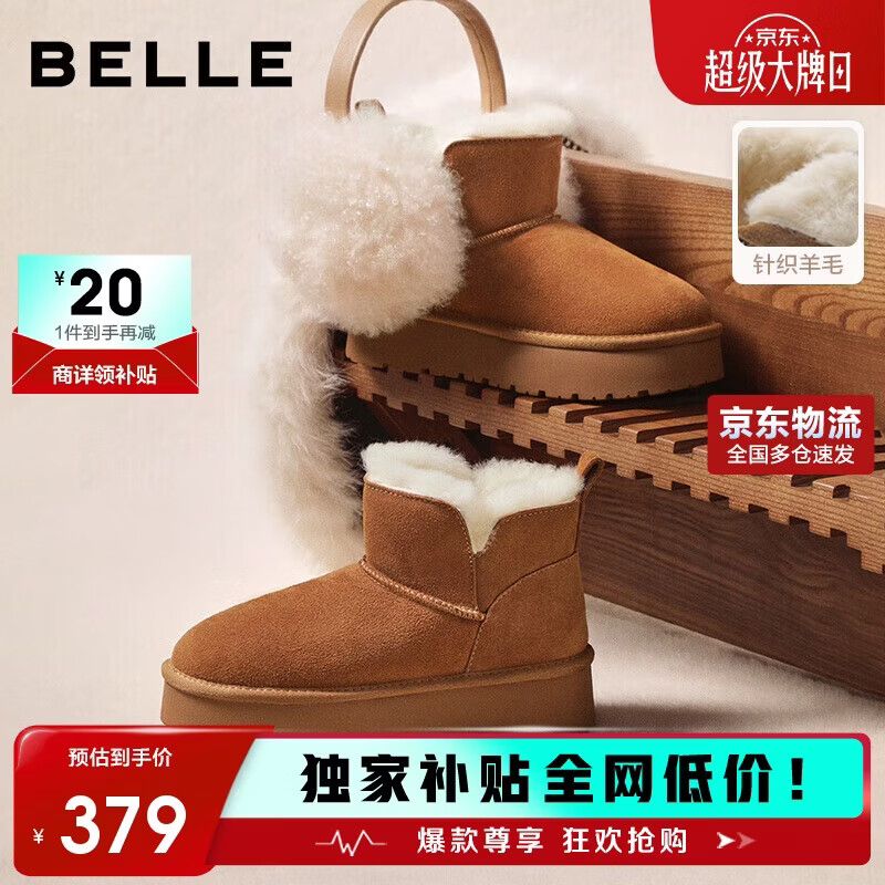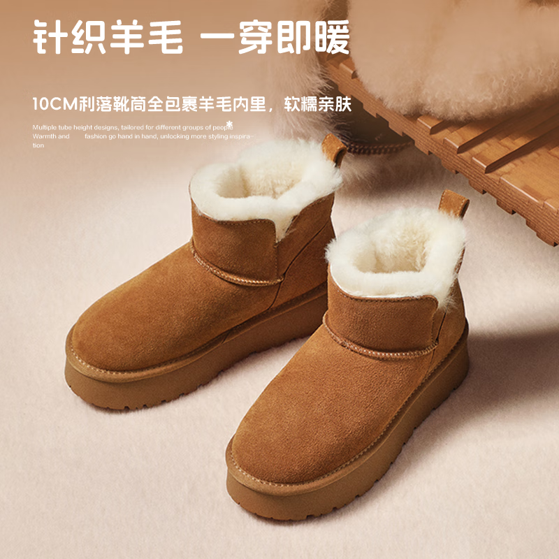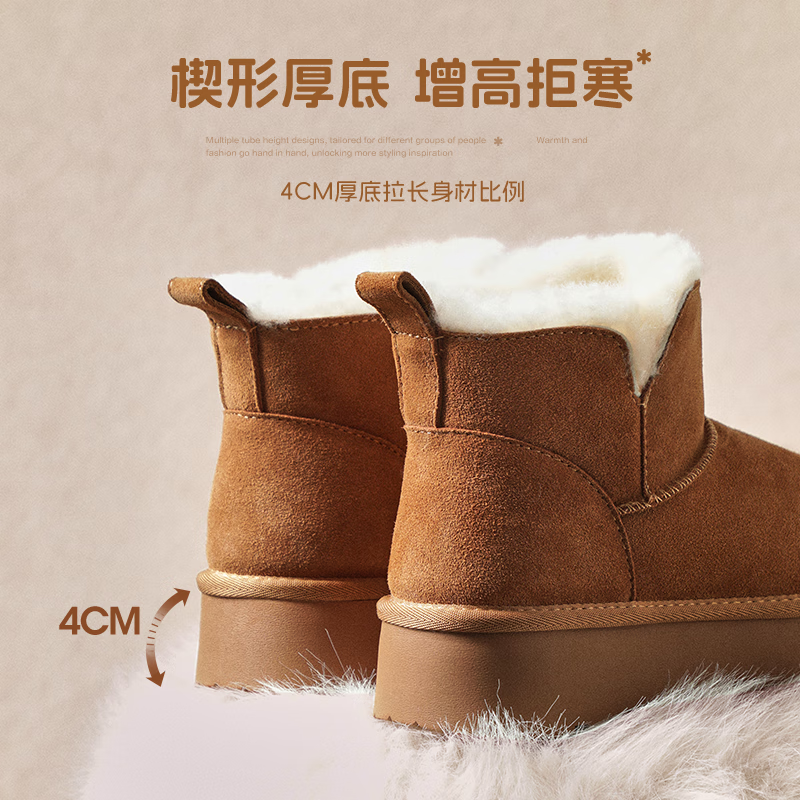 百丽慵懒百搭厚底雪地靴女靴子冬季增高加绒短靴JD016DD5 可可栗 37