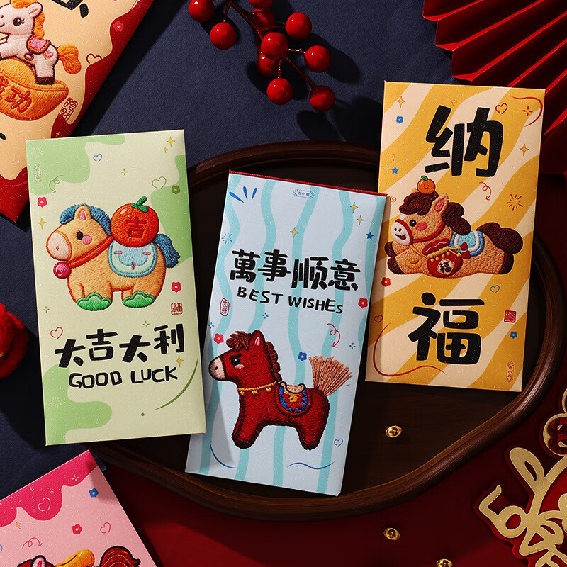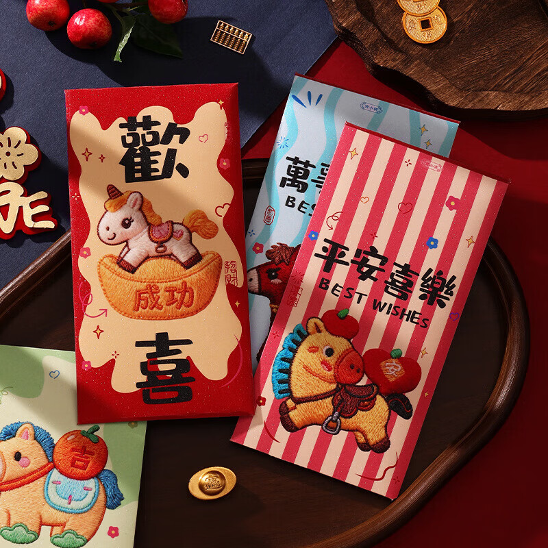 2026新款马年加厚立体刺绣风卡通用创意红包袋过年春节可爱压岁钱通红包压岁钱本册纸签 1包6个混装【随机】