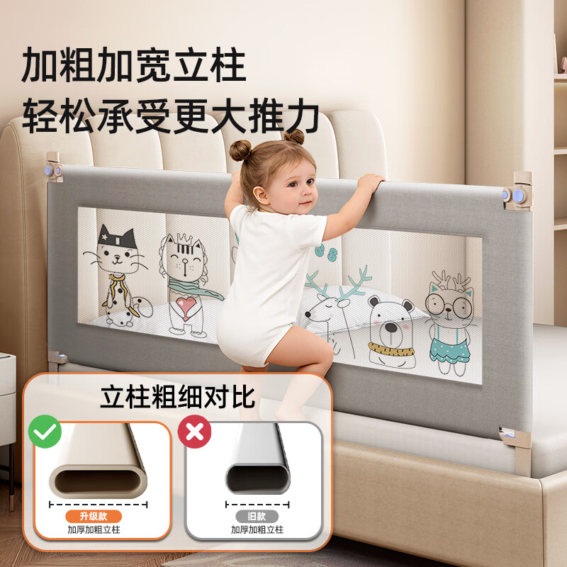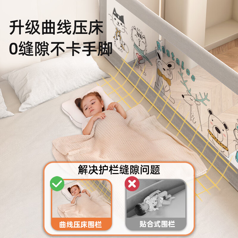 AOTGSSE爱蒂逊三面床围栏婴儿童床挡板床上防摔床围挡安全护栏床边床护栏 浅灰卡通动物 三面装 【更安全】 1.8米床【1.8+2.0+2.0】稳固无缝